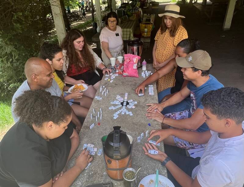 On Sunday night, we invited our Barcelos friends who are from Northeast Brazil to join us at the municipal park for a potluck picnic of traditional "Nordestino" food. Keith enjoyed chatting with wonderful people, make connections, and sharing memories.